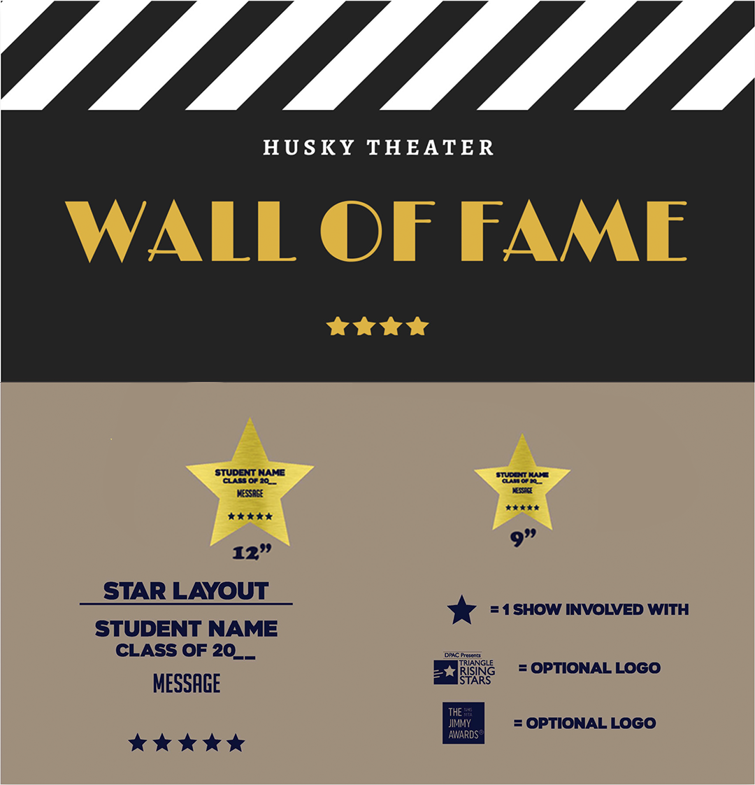 Celebrate your theater student (9th grade - alumni) with a custom star in the Heritage Theater alcove! Each star will be a laminated brushed gold with glittered blue vinyl lettering.
